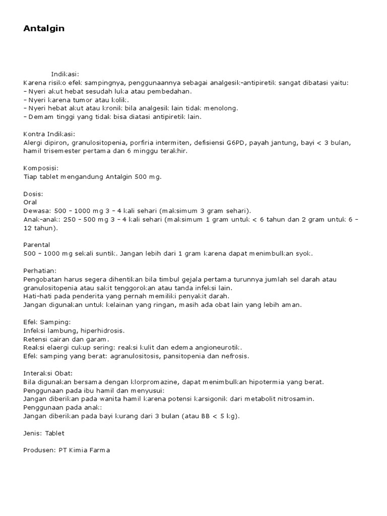 Antalgin Metampiron Dosis Indikasi Dan Peringatan